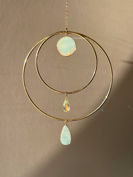 Meera light gold hoop suncatcher home decor with two big rose quartz/amazonite pendant