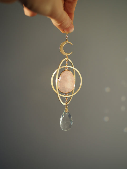 Rose quartz crystal sun catcher with moon pendant, rainbow prism, light diffuser, home decoration, housewarming gift, birthday gift