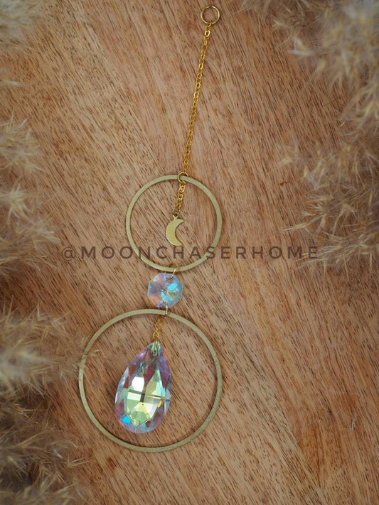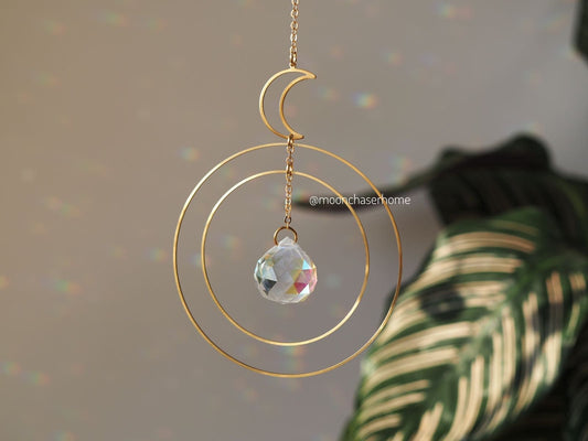Luna crystal sun catcher with brass moons, rainbow prism, light diffuser, boho home decoration, housewarming gift