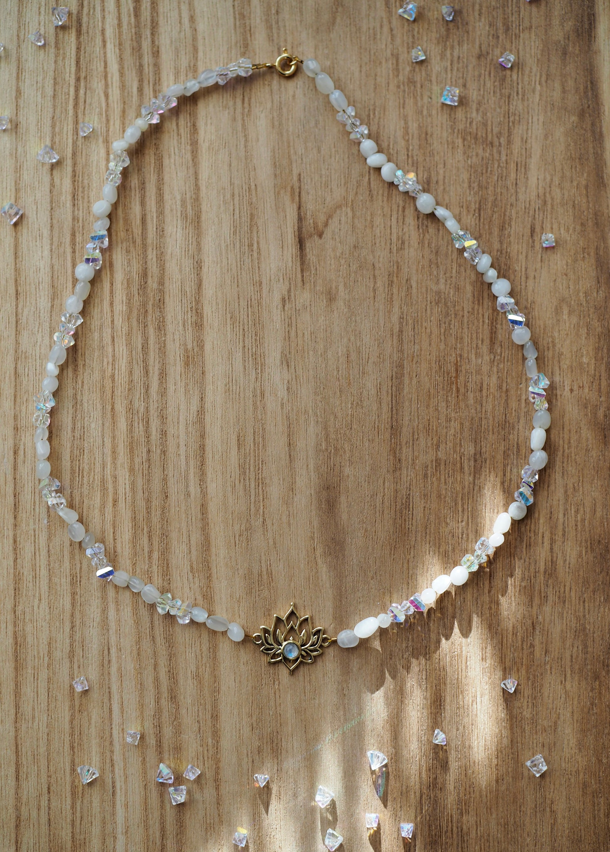 This delicate, handmade necklace combines the soft, mystical glow of moonstone with the subtle sparkle of faceted glass beads. At the center sits a detailed lotus charm with a luminous moonstone, gently reflecting light with its signature blue flashes.