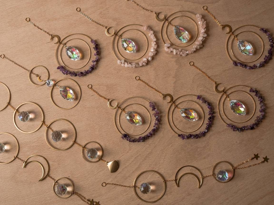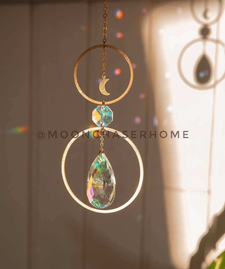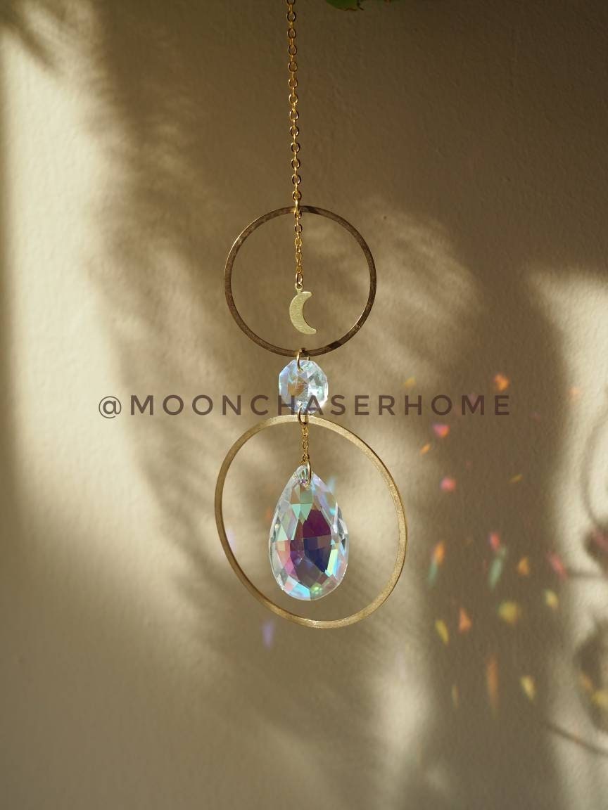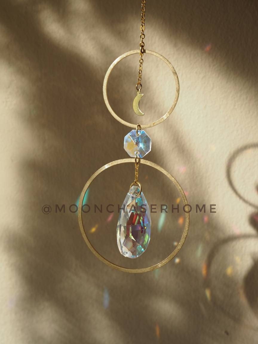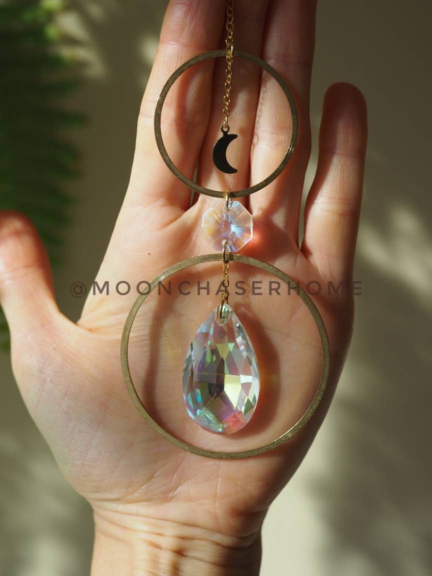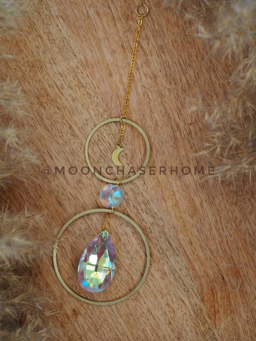 Handmade suncatcher with brass circle and moon. Hang it in a window or car with direct sunlight for the full sparkle and shimmer effect.