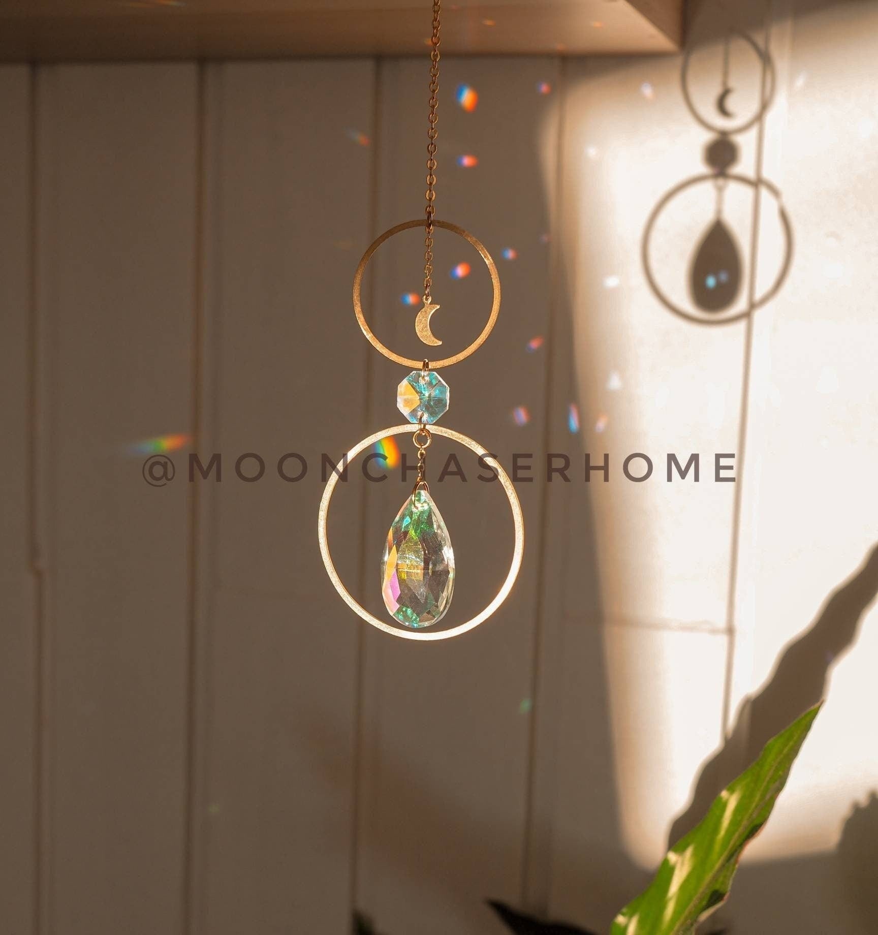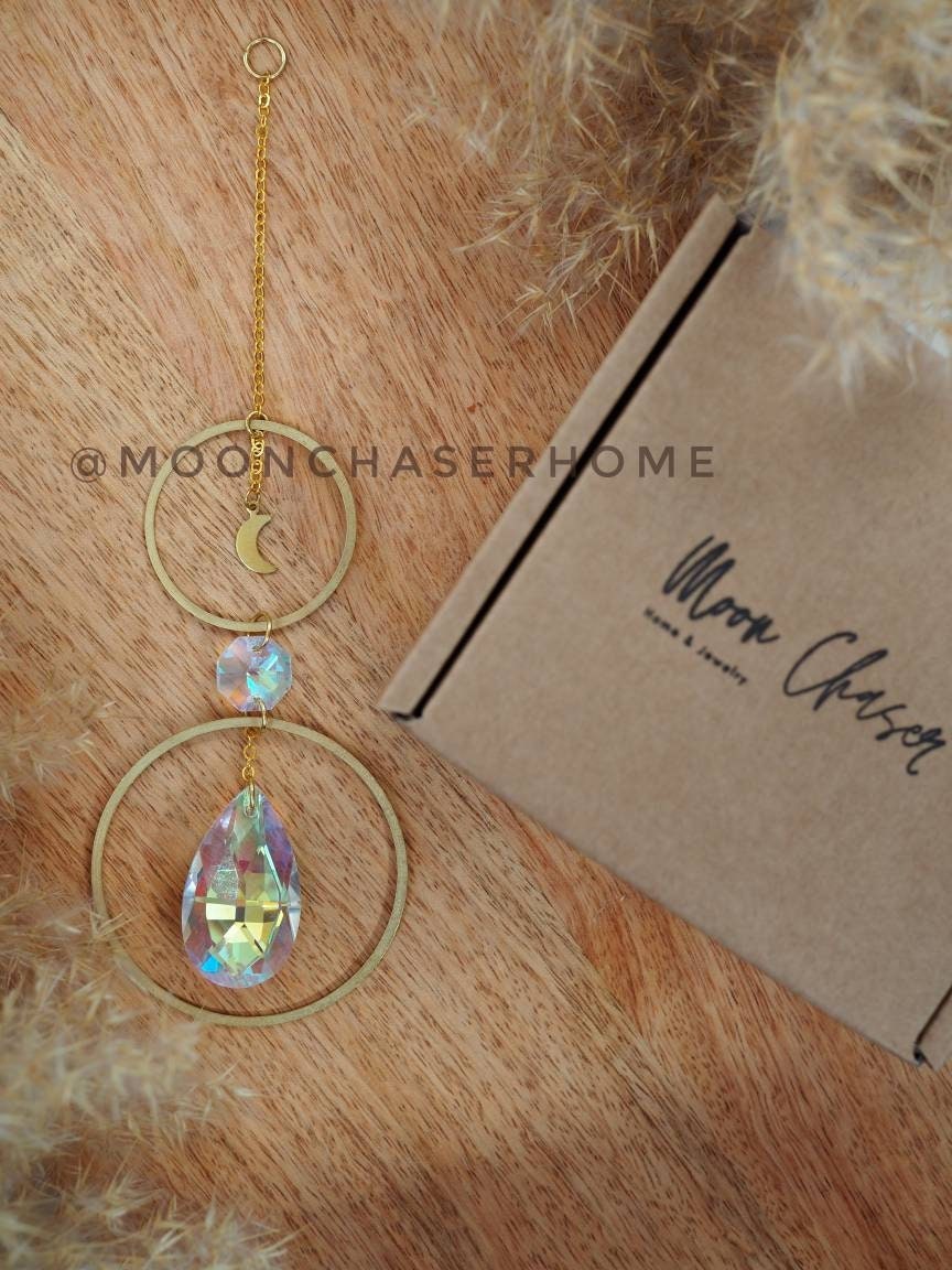 Annie car charm-suncatcher with brass moon, rainbow prism, light diffuser, boho home decoration, housewarming gift