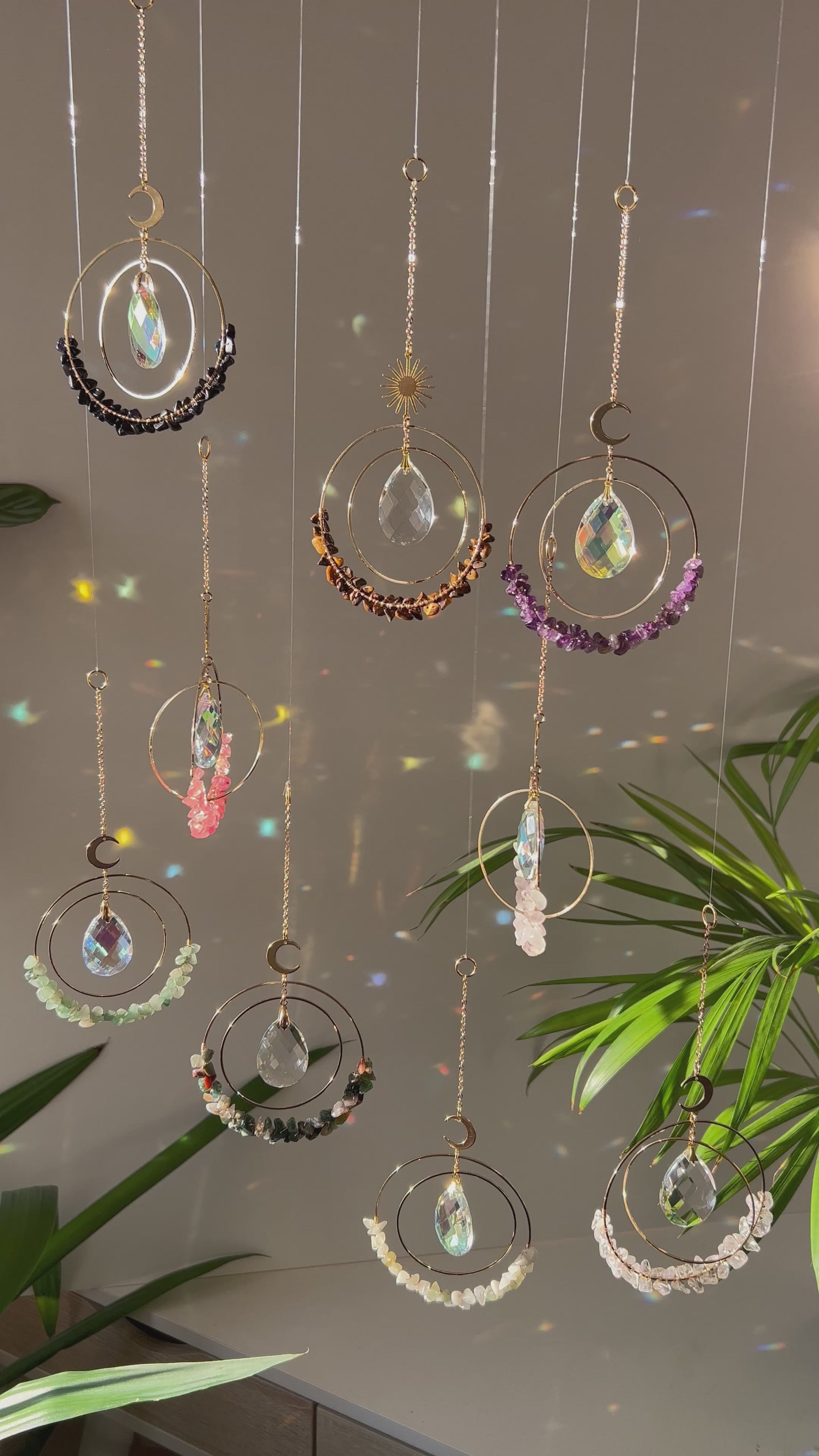 Handmade suncatcher with sun pendant + natural crystals: amethyst/ rose quartz / clear quartz/ fluorite/ jade/blue sandstone/green aventurine/tiger eye/ citrine/indian agate/smoky quartz/onix/ labradorite/amazonite/milky quartz/strawberry quartz ect. crystals.
