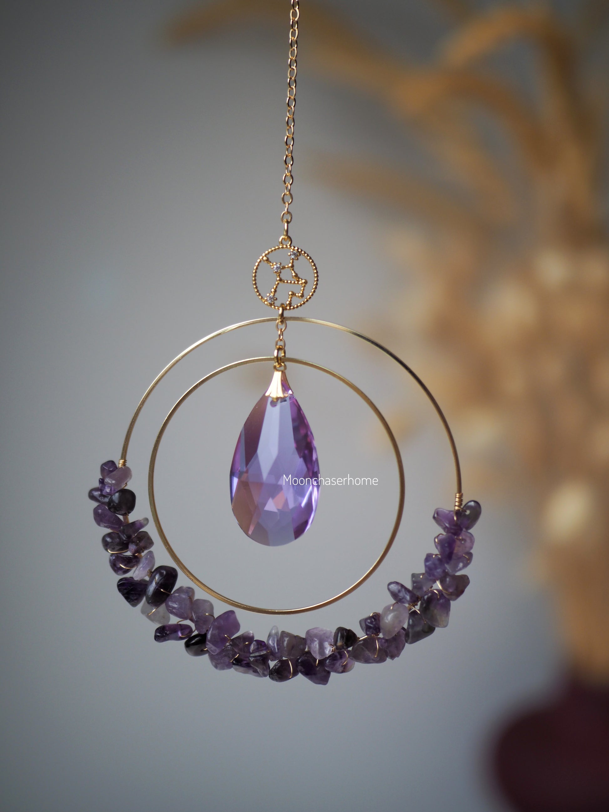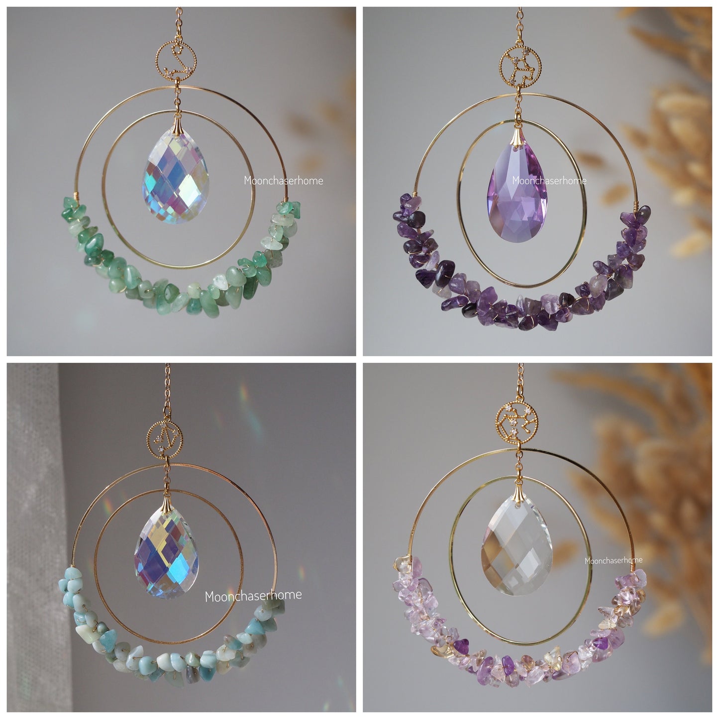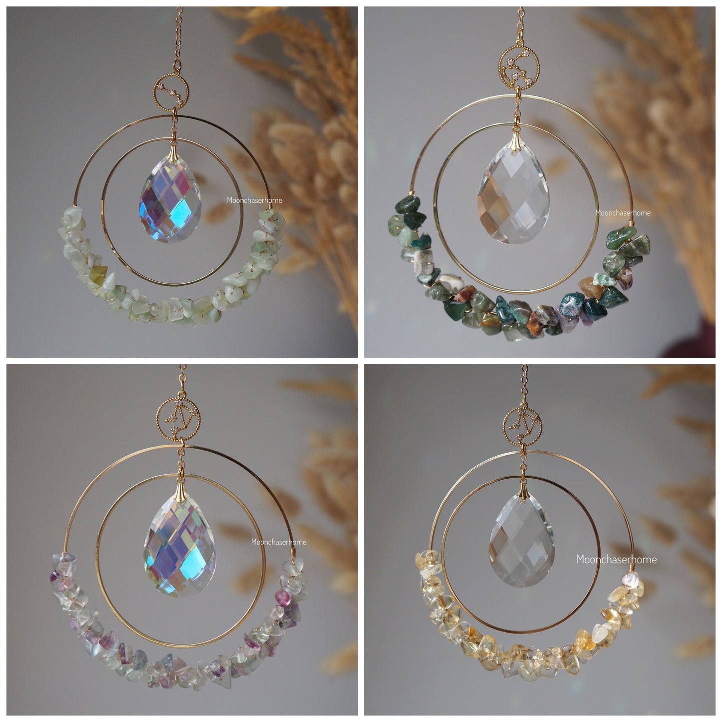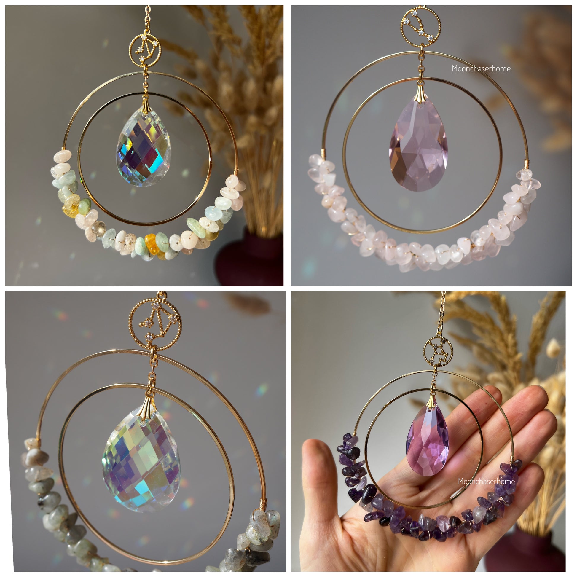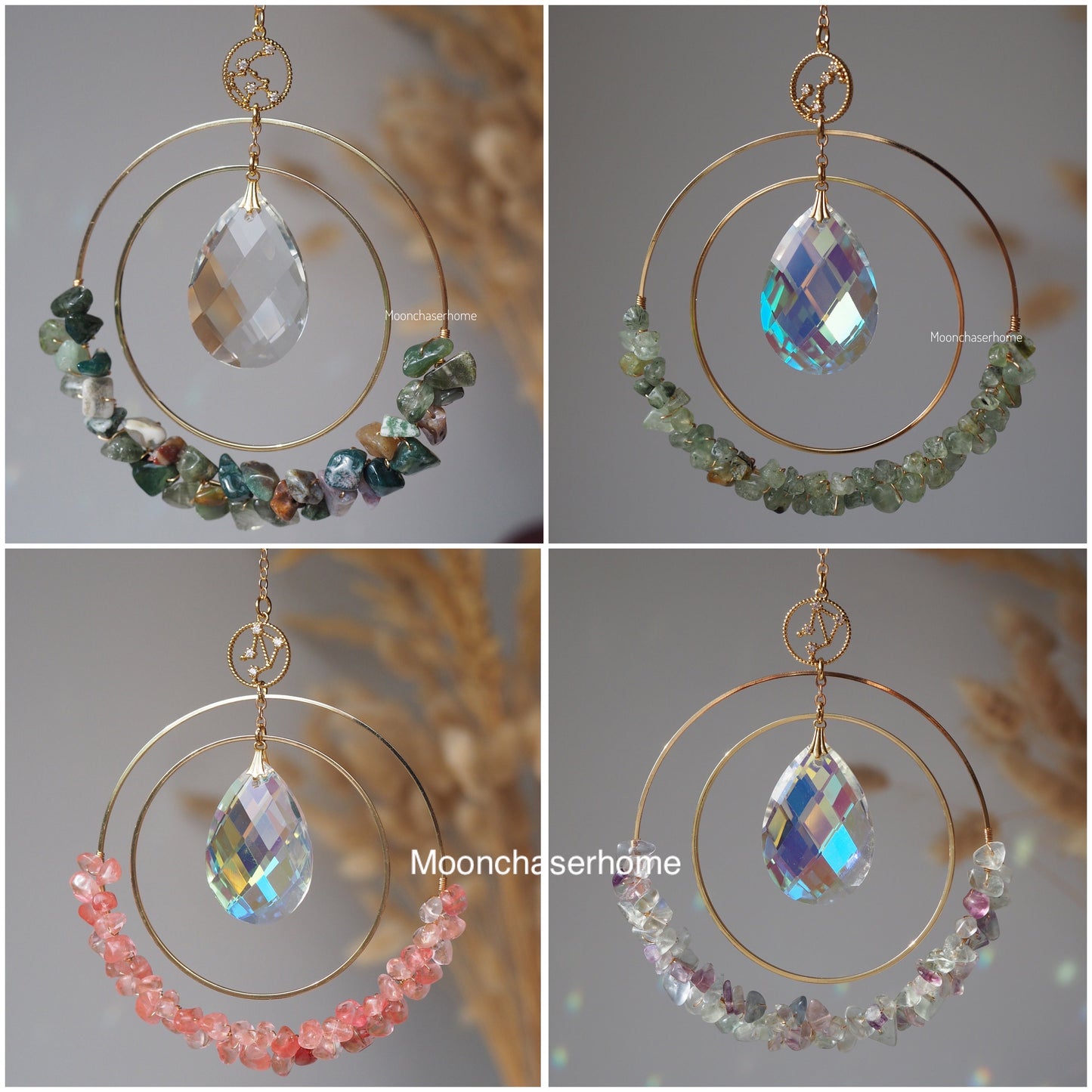 Handmade suncatcher with 18K real GOLD PLATED circles + Gold filled Zodiac pendants+ natural crystals: amethyst/ rose quartz / clear quartz/ fluorite/ jade/blue sandstone/green aventurine/tiger eye/ citrine/indian agate/smoky quartz/ labradorite/amazonite/milky quartz/cherry quartz ect. crystals.