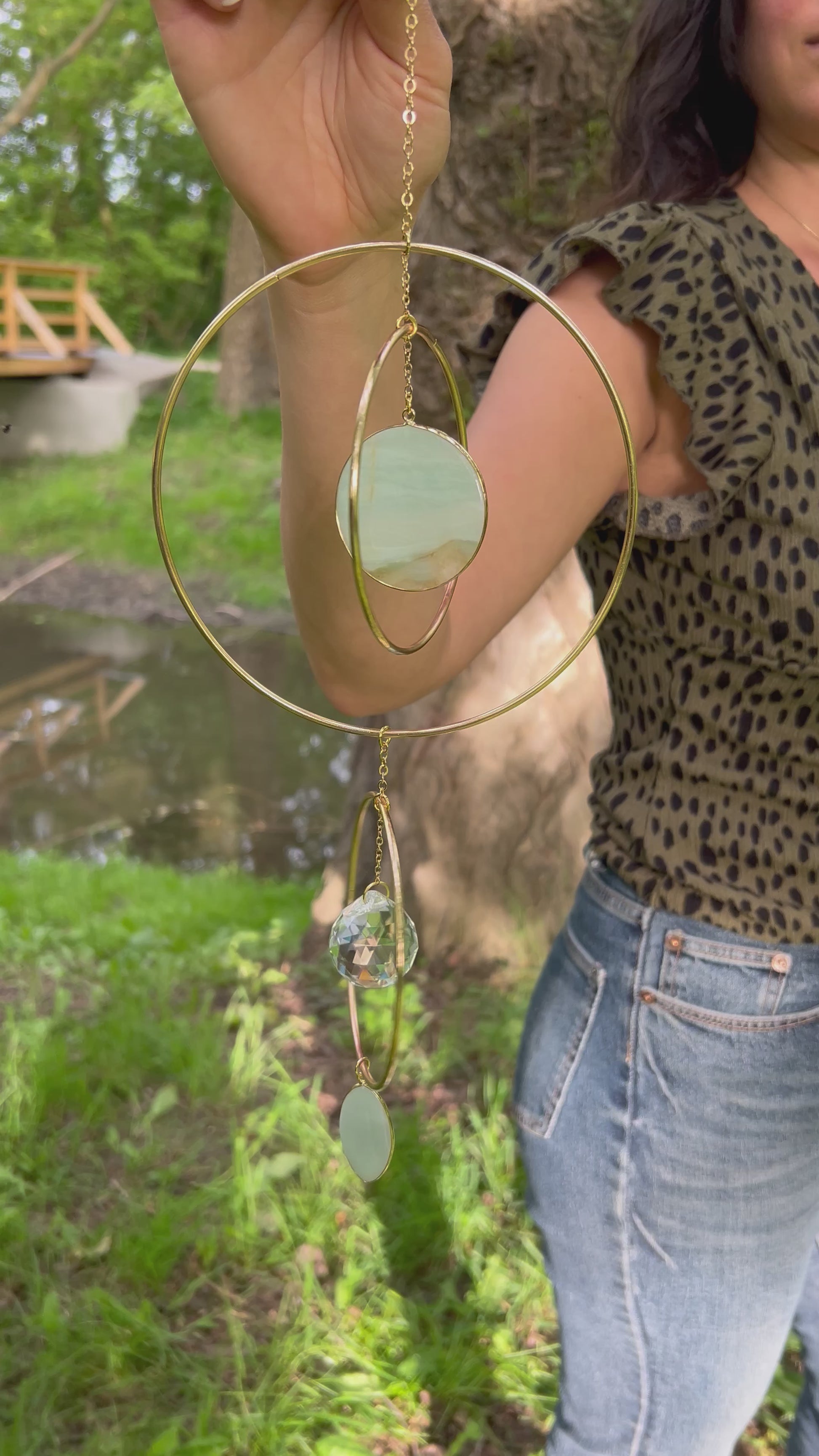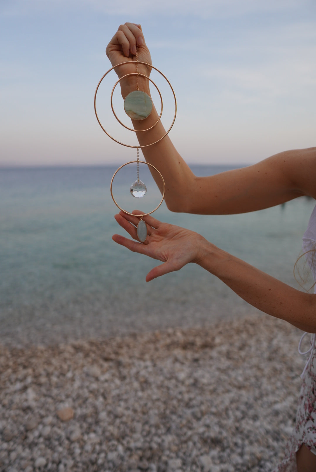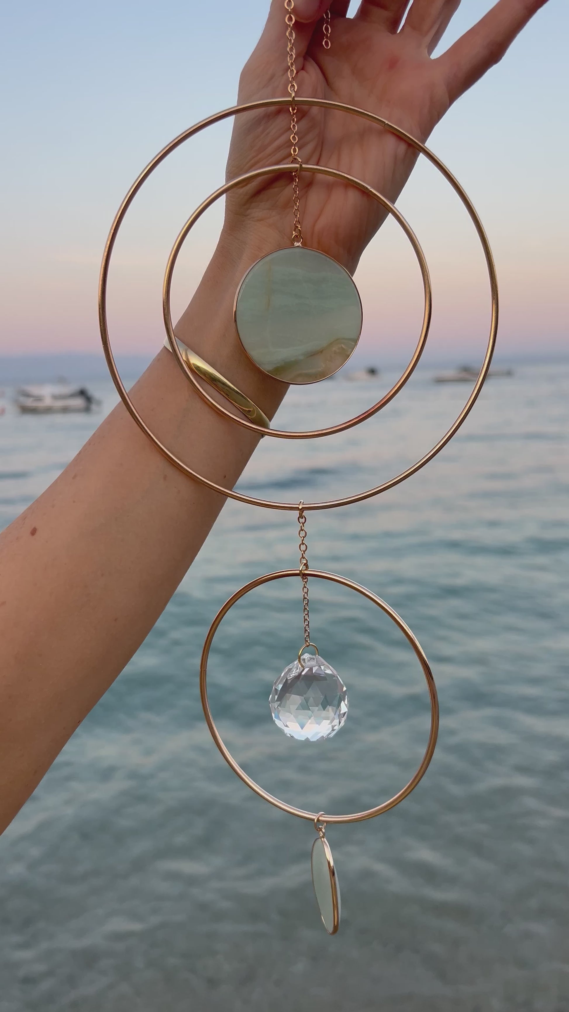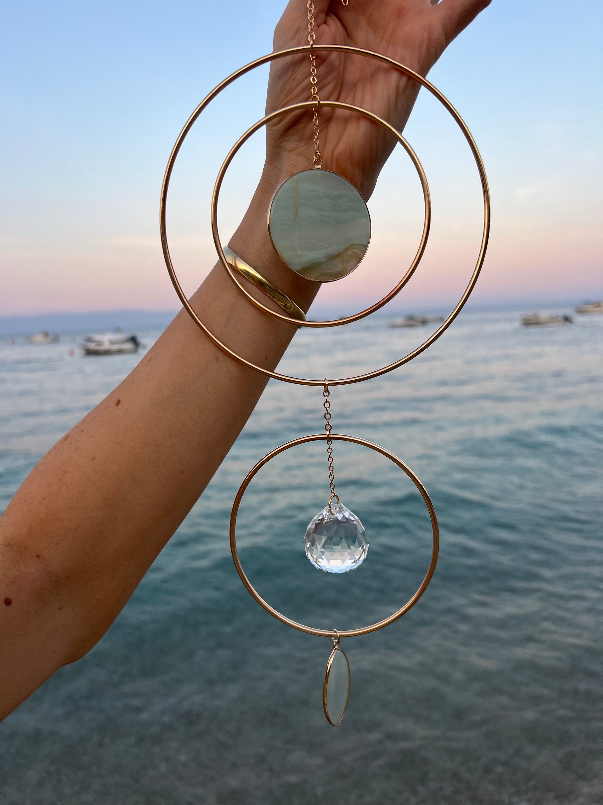 Meera light gold hoop suncatcher home decor with two big rose quartz/amazonite pendant