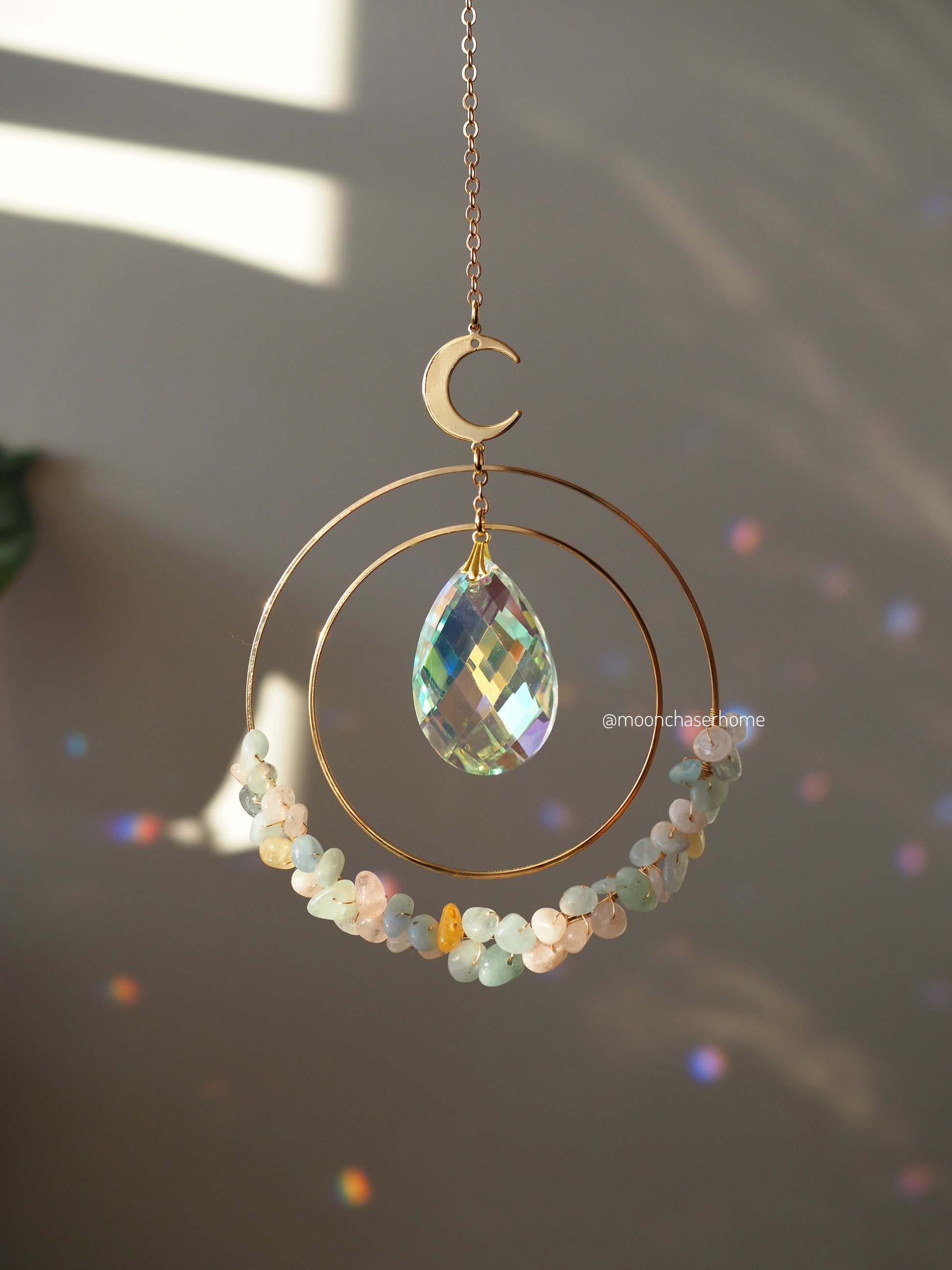 Crafted with care and precision, this stunning suncatcher features a real 18k gold plated circle and moon or sun pendant at the top, adding an elegant and sophisticated touch to the design. The pendant is carefully adorned with a selection of gemstones, including rose quartz, amethyst, green aventurine, citrine, and more, each one tightly wrapped around the circle.