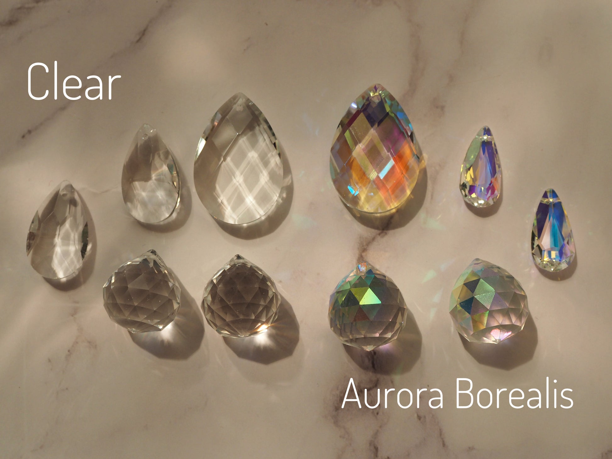 You can choose aurora borealis (colored) glass beads and crystal clear glass beads, but I can also make many suncatchers with light purple and light pink glass prisms.