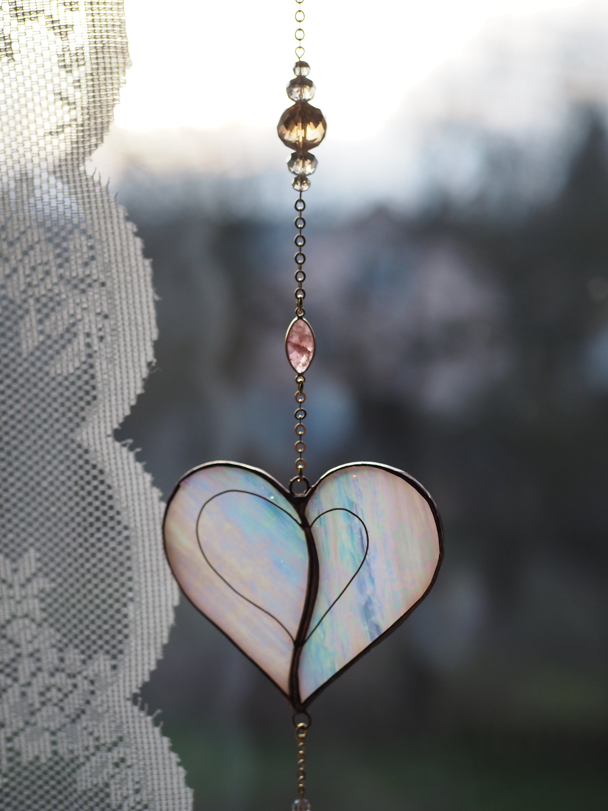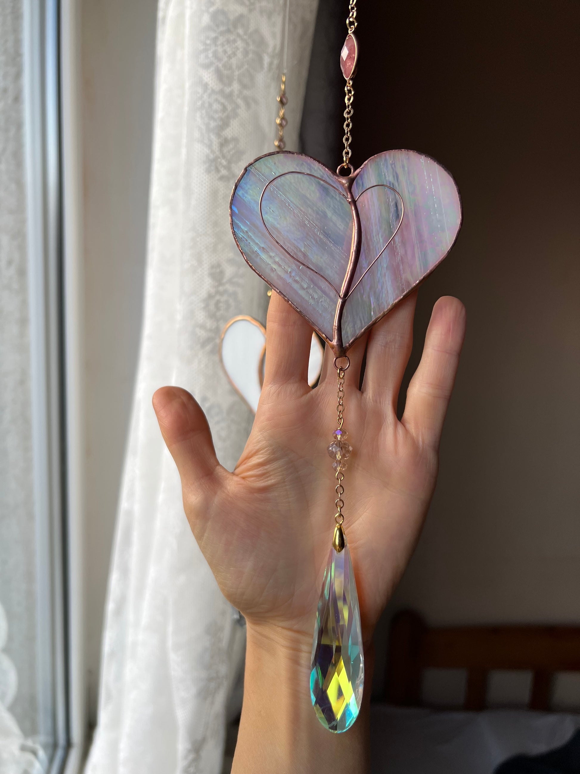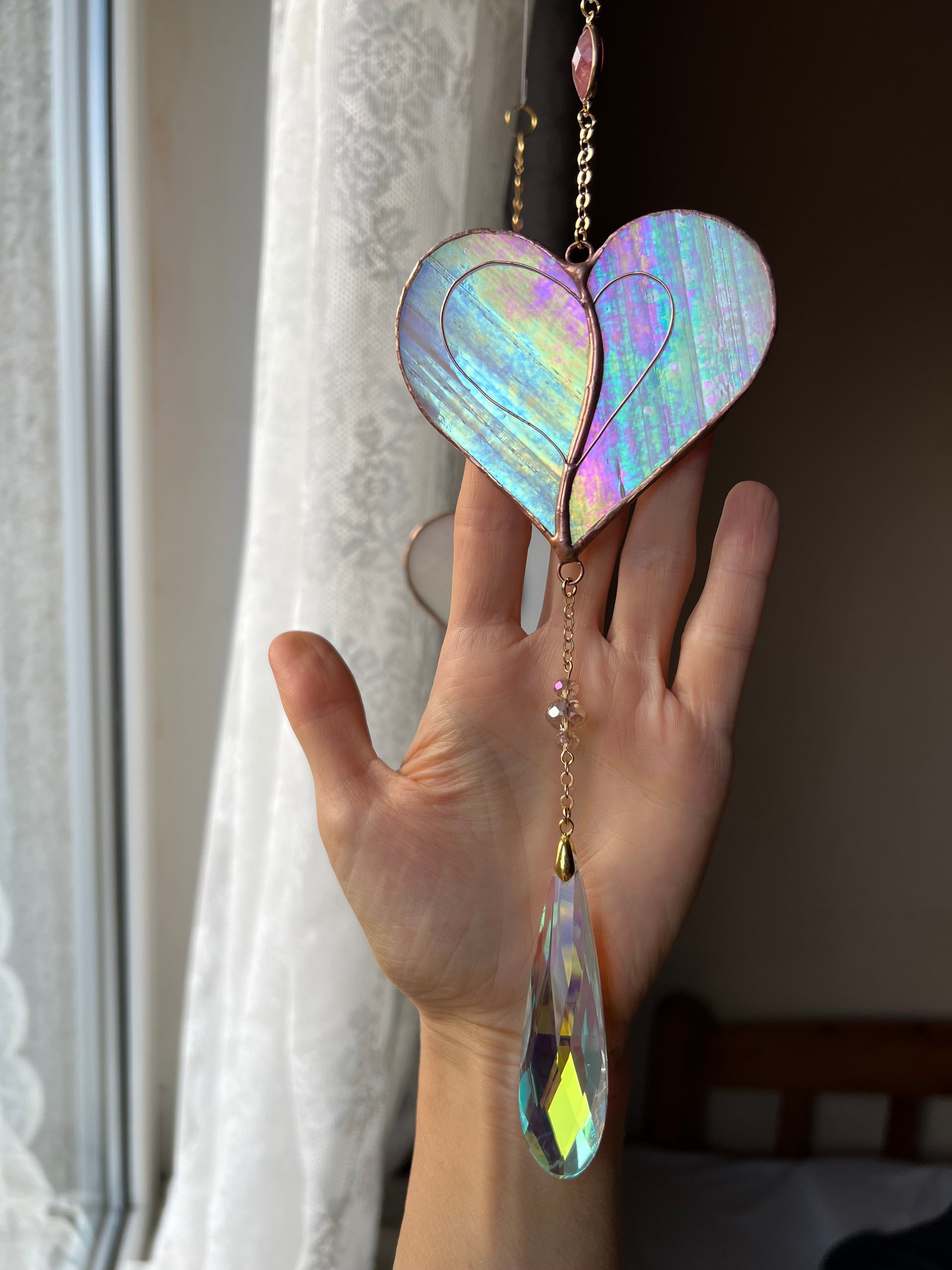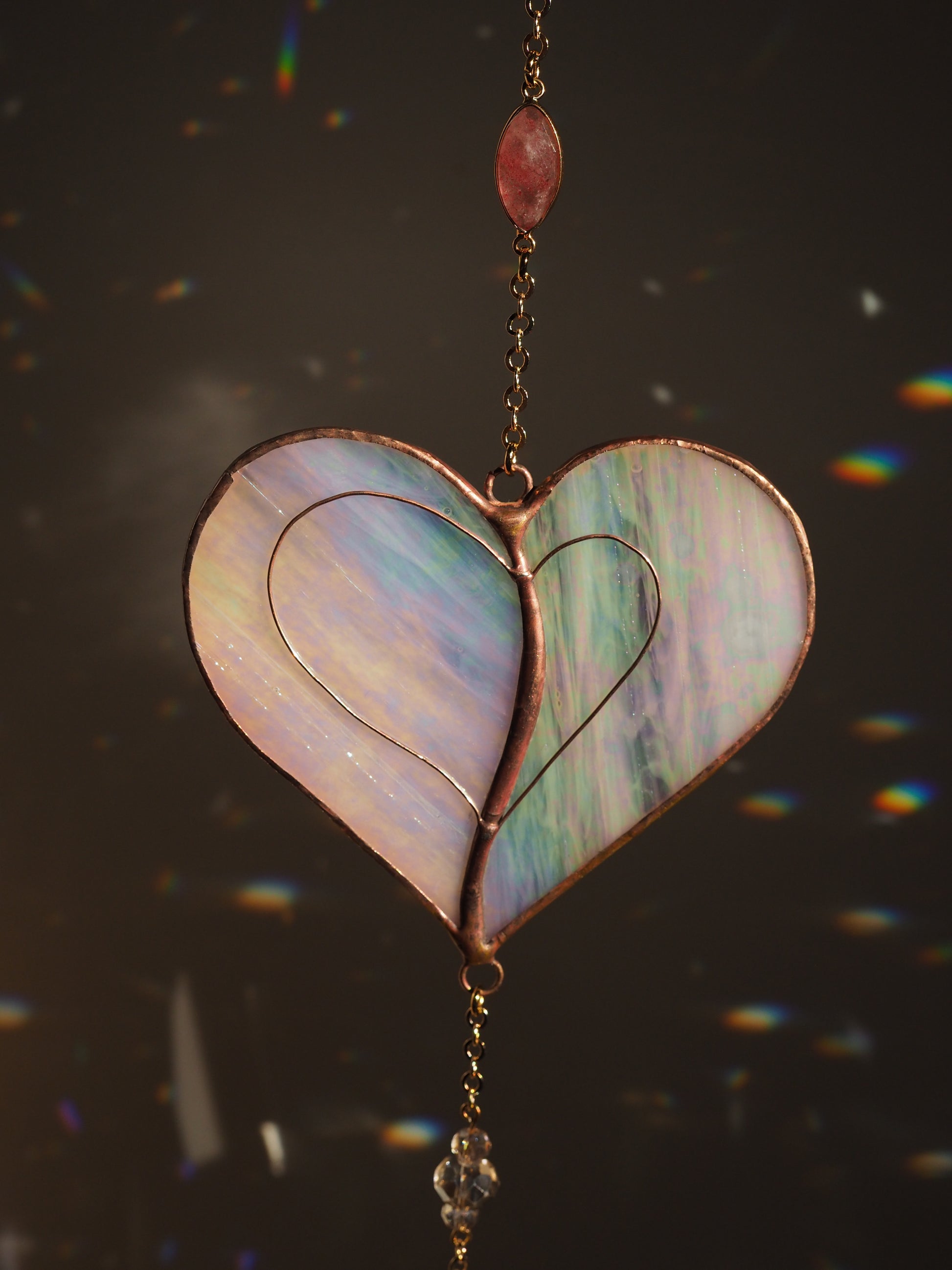 This handmade stained glass heart suncatcher is a stunning decoration that brings warmth, light, and color into any space. Made with Aurora Borealis glass, it shimmers in ever-changing hues and creates mesmerizing prism reflections when sunlight hits it.