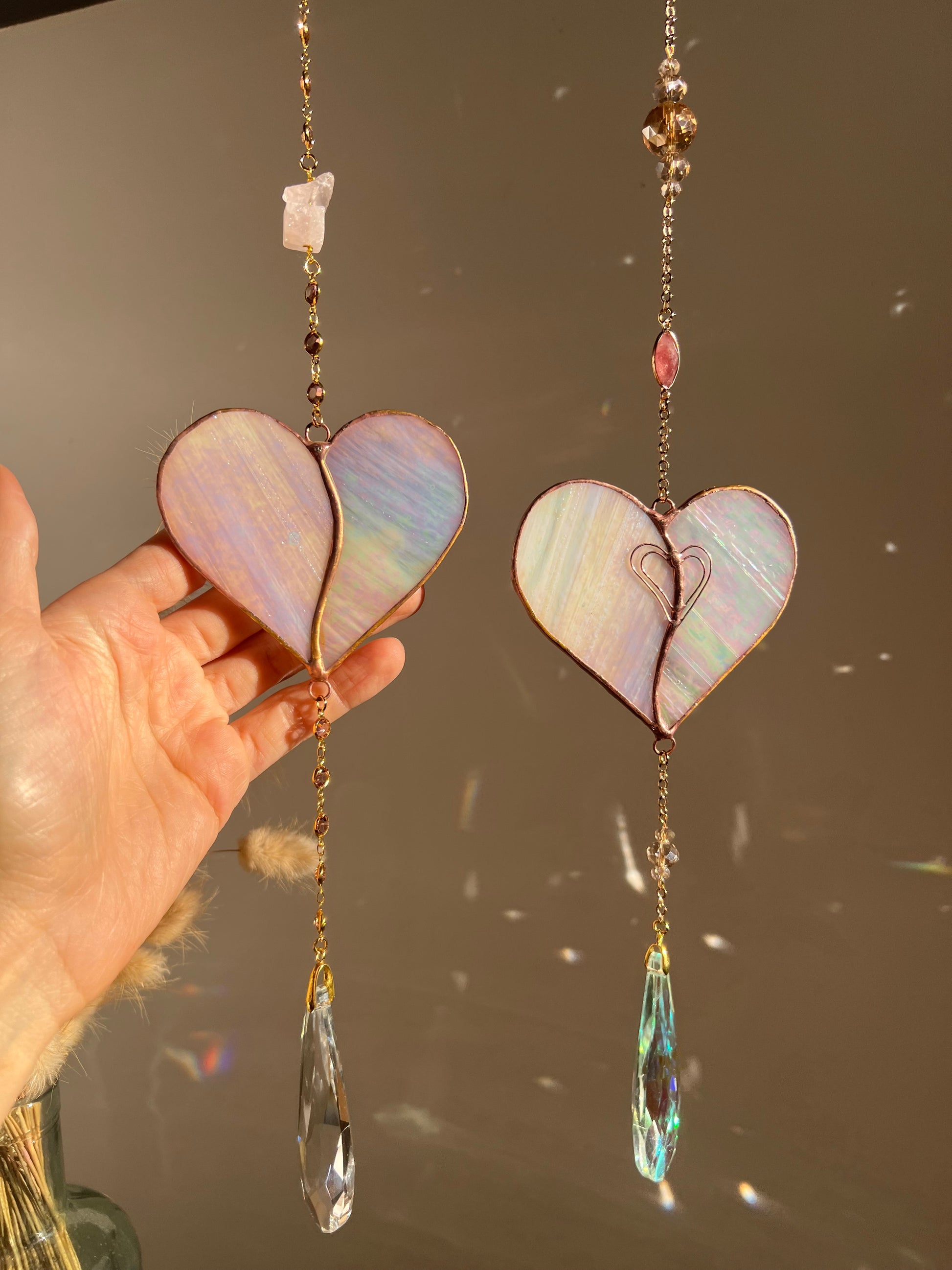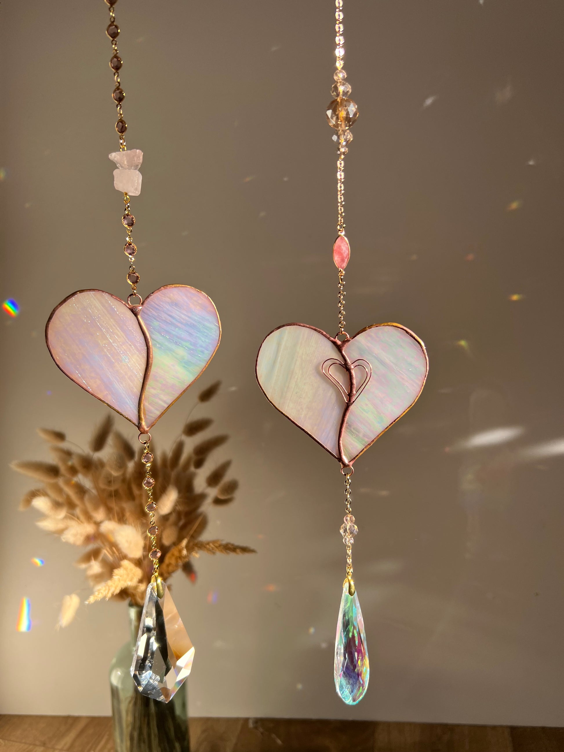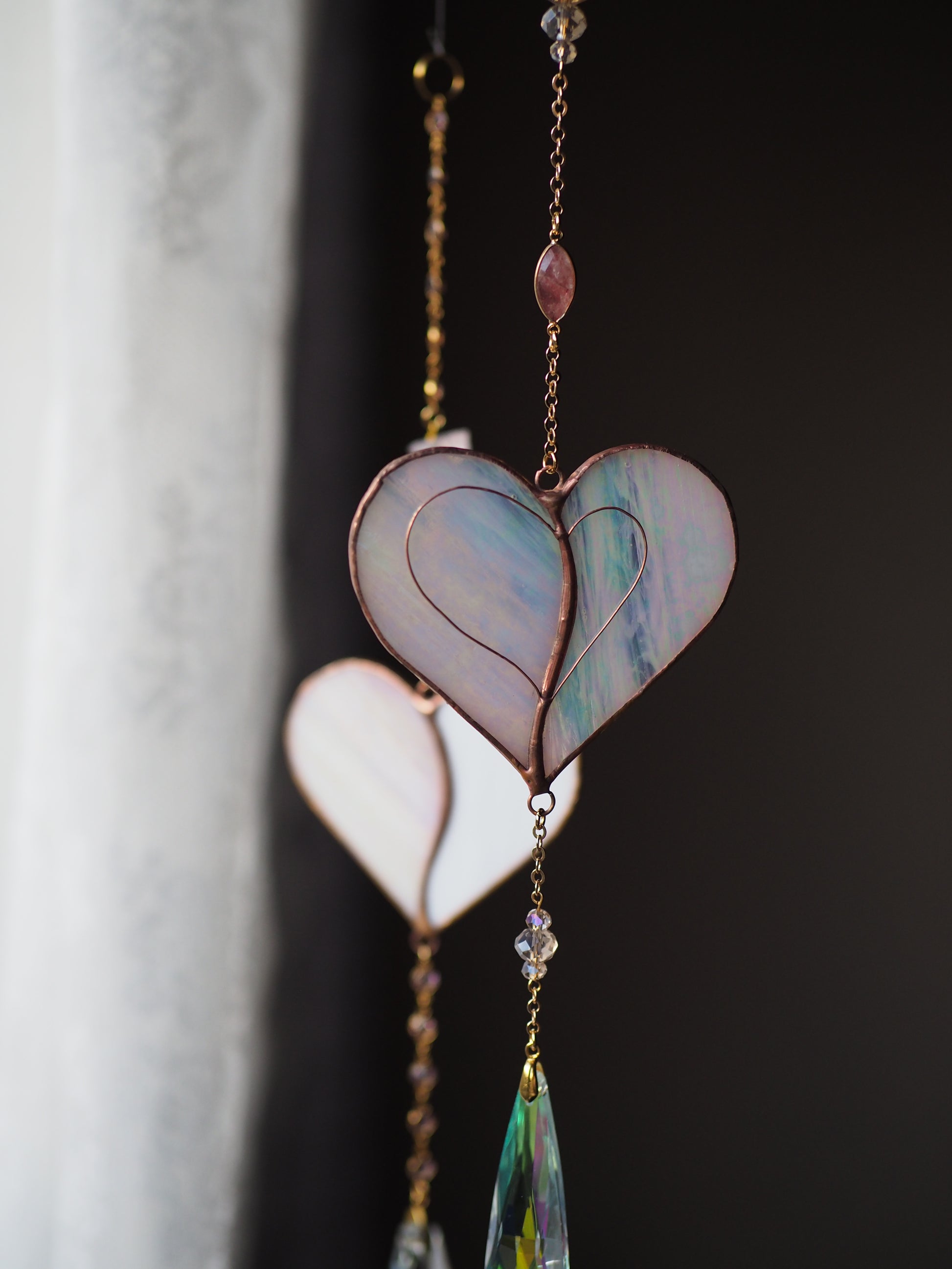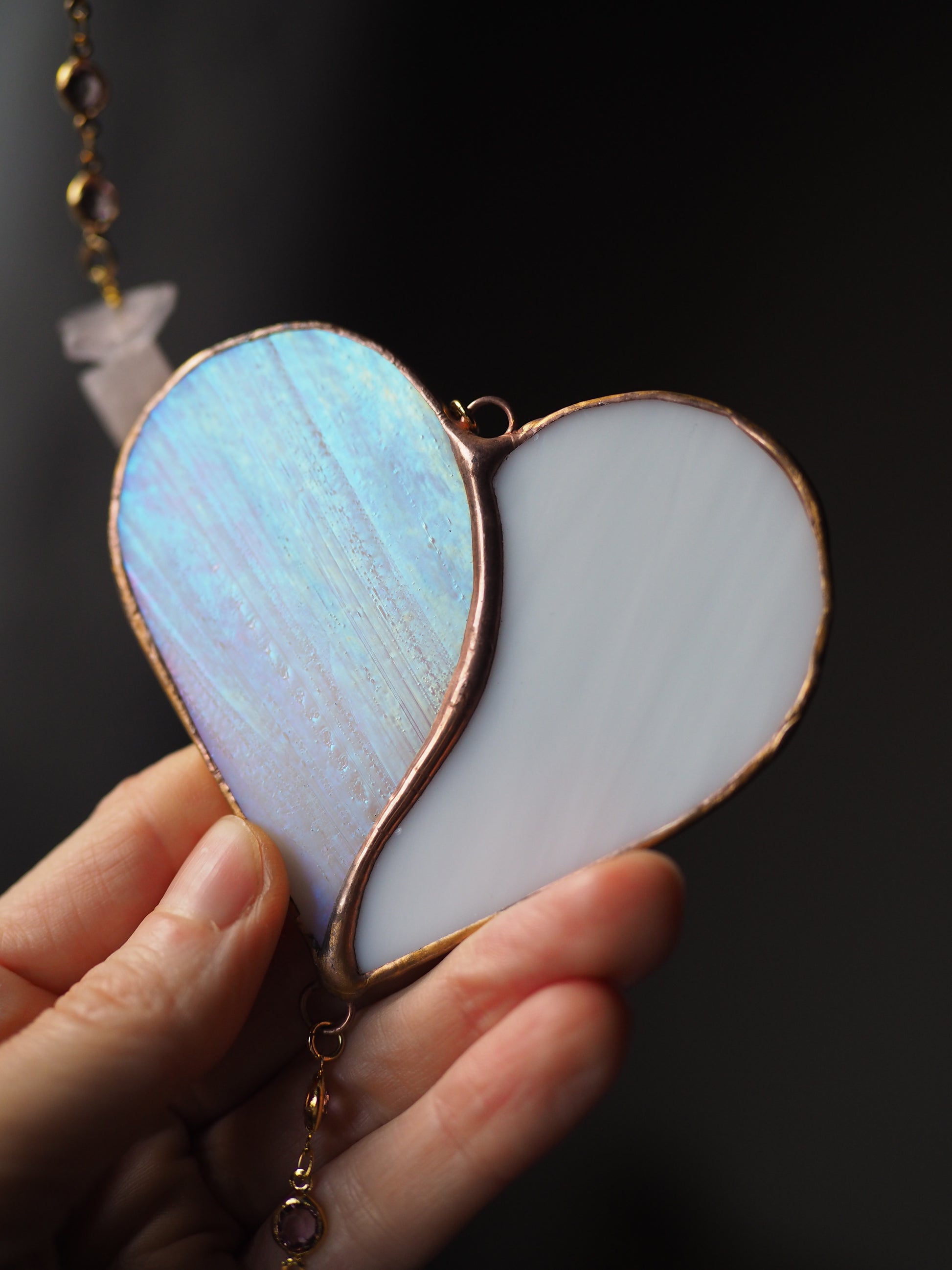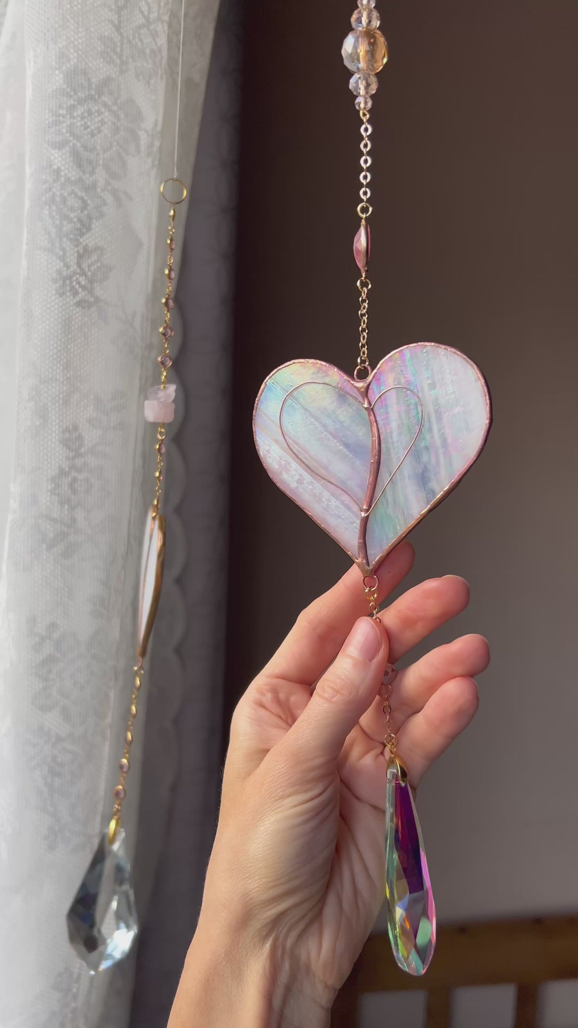 This handmade stained glass heart suncatcher is a stunning decoration that brings warmth, light, and color into any space. Made with Aurora Borealis glass, it shimmers in ever-changing hues and creates mesmerizing prism reflections when sunlight hits it.