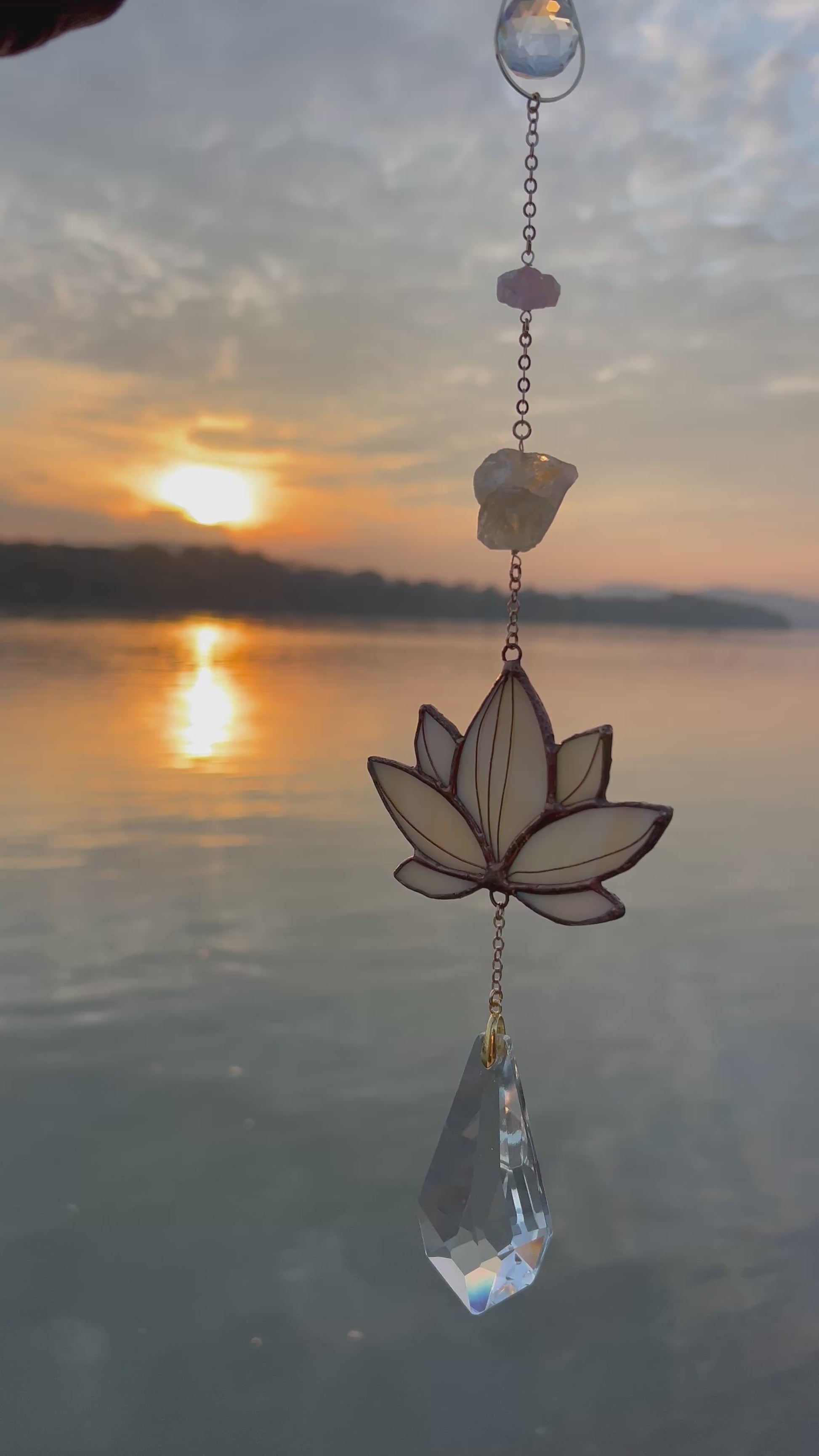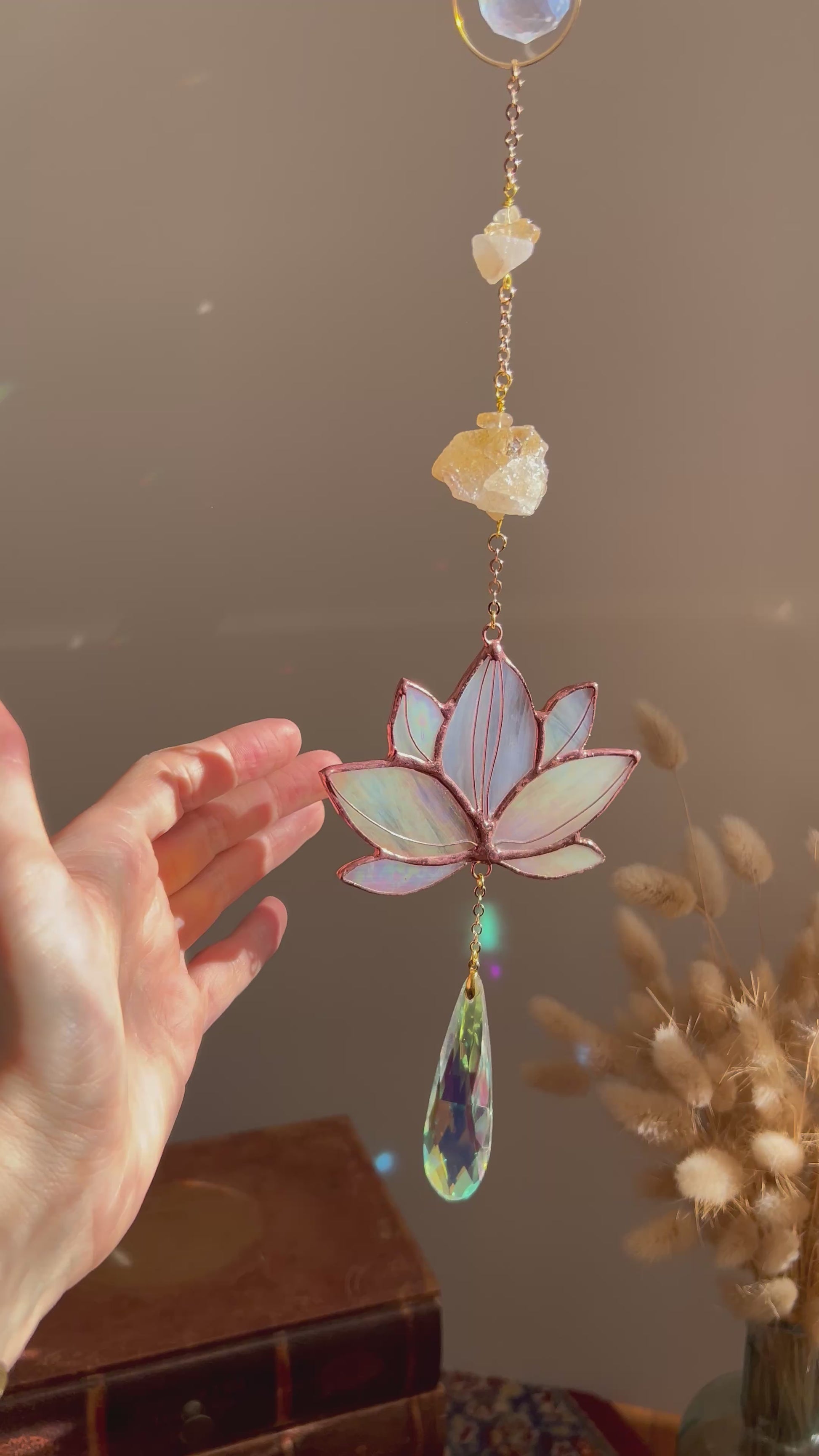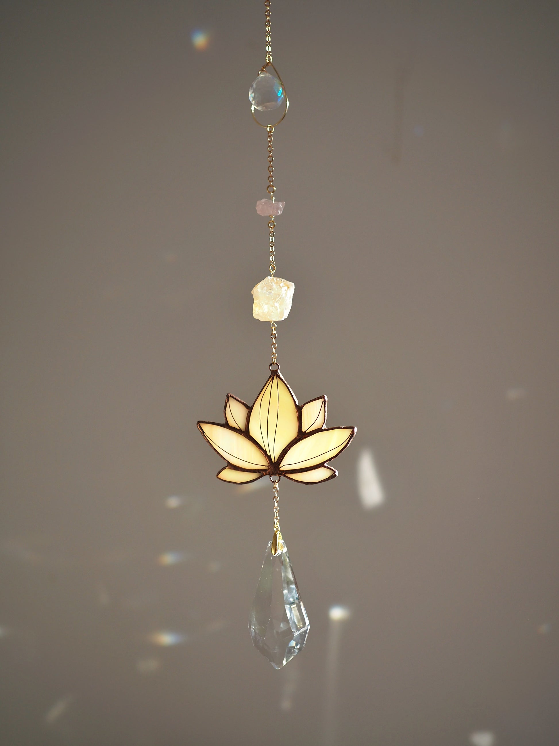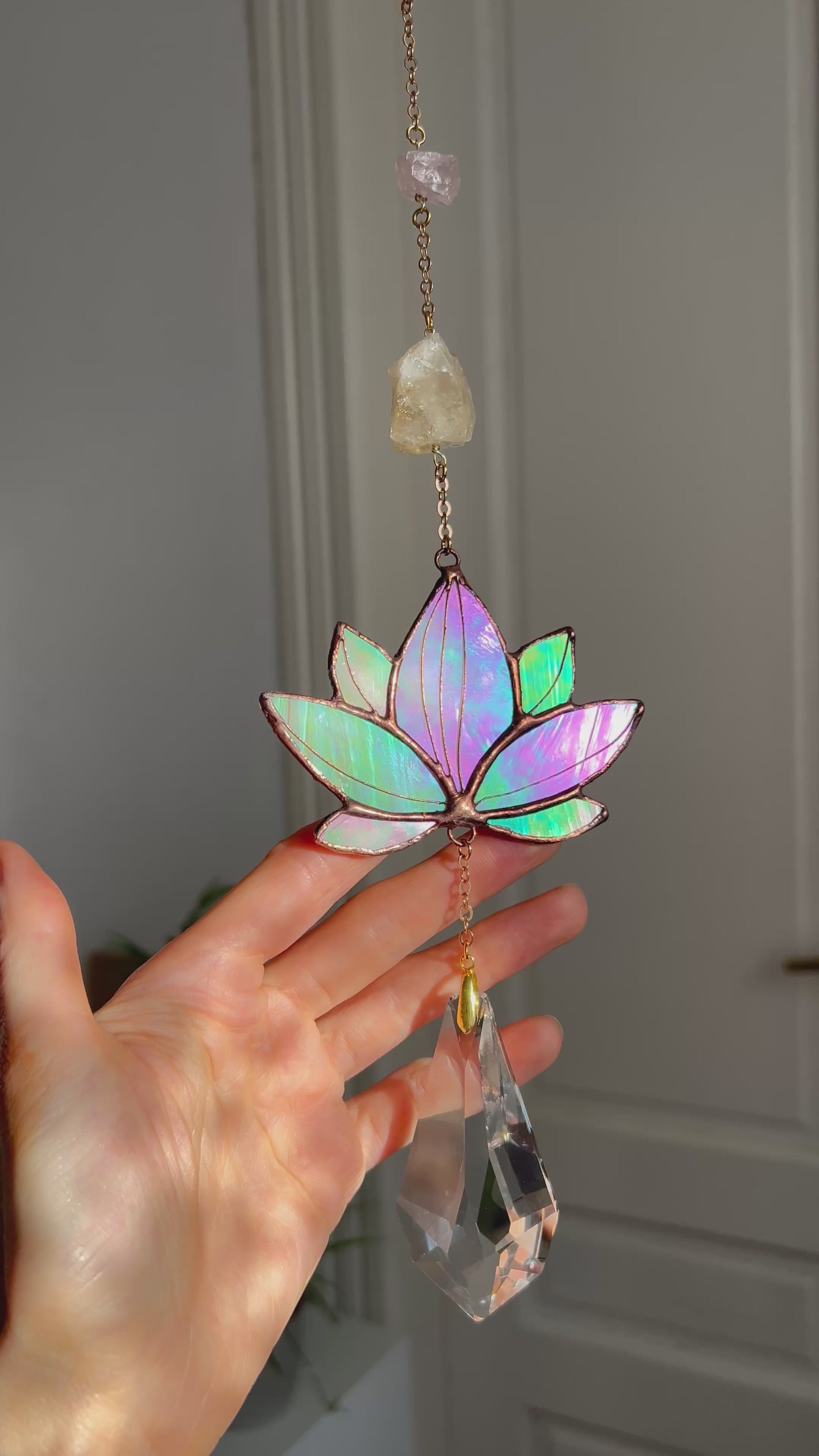Stained glass window hangings lotus flower suncatchers with natural crystals big prism hanging decor