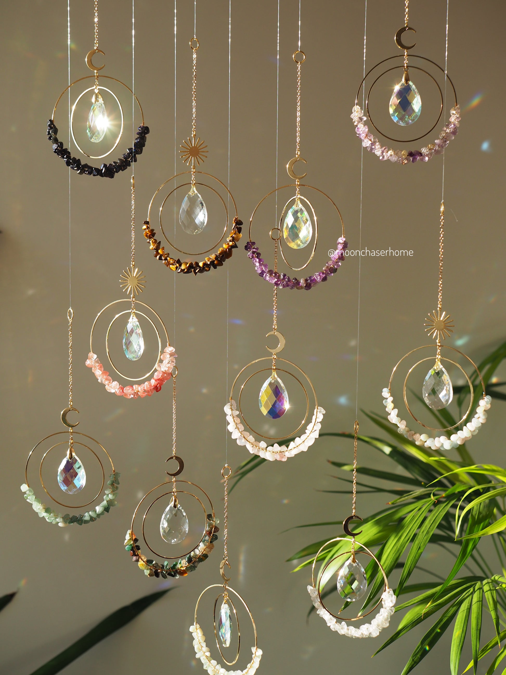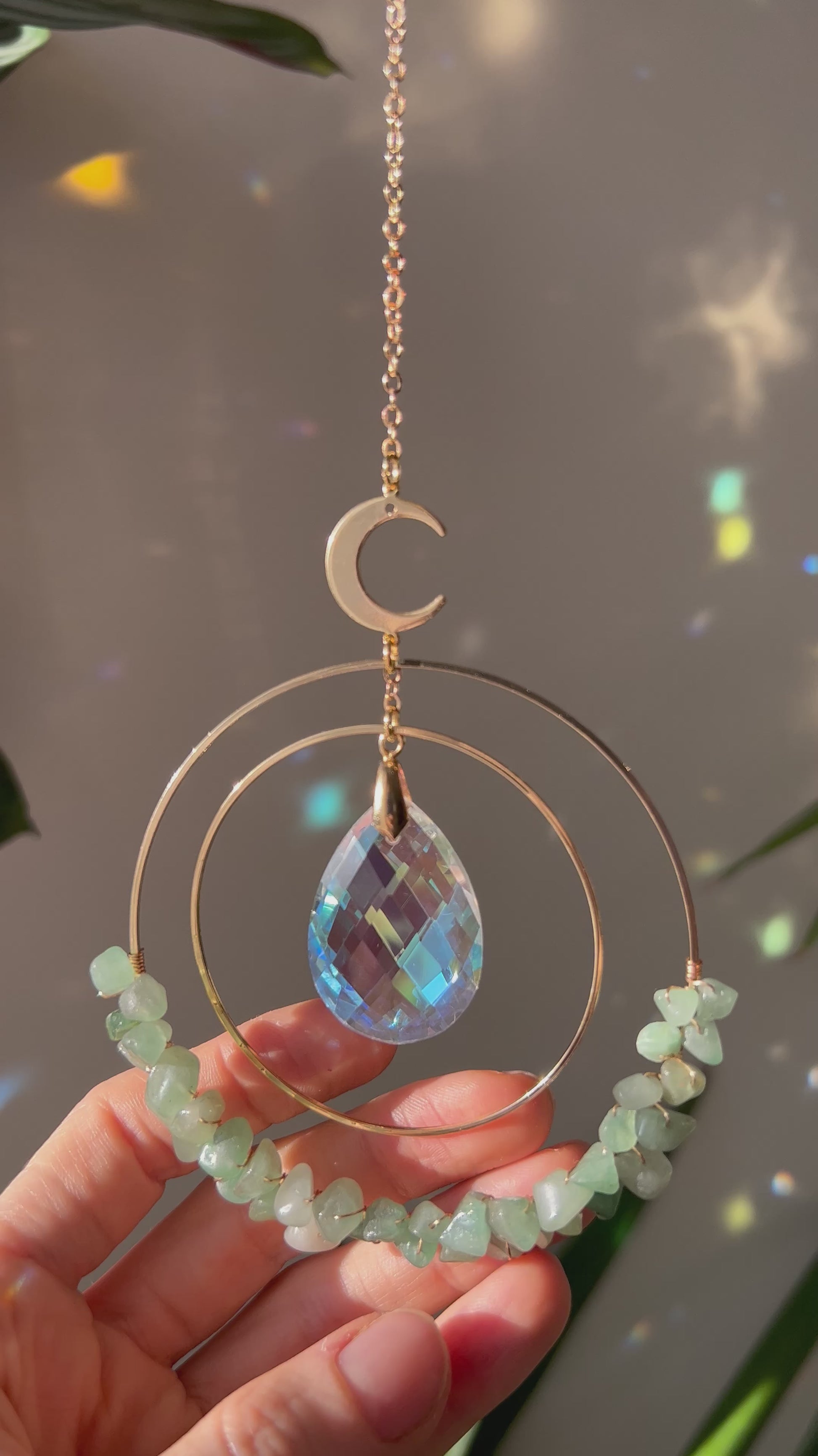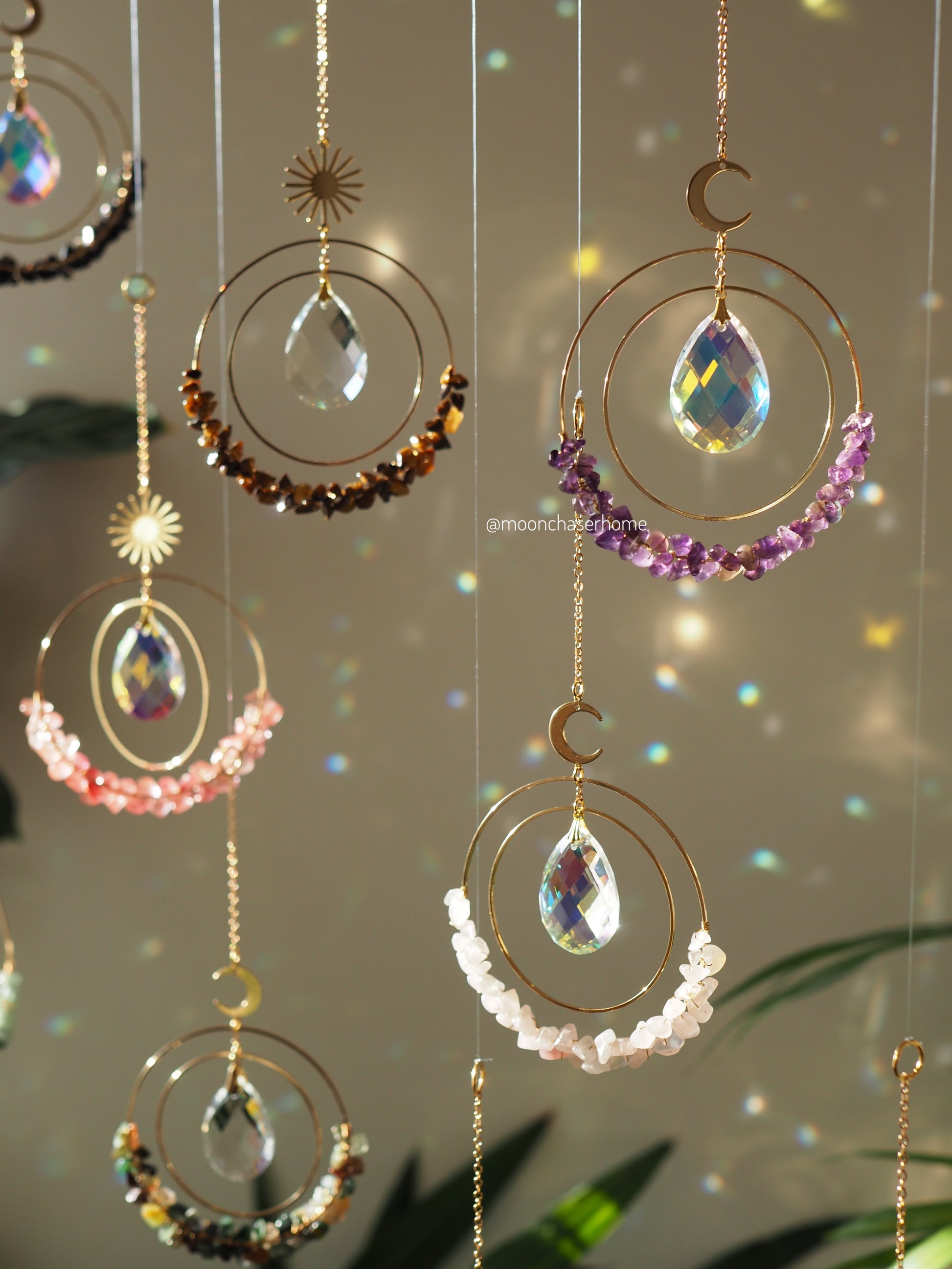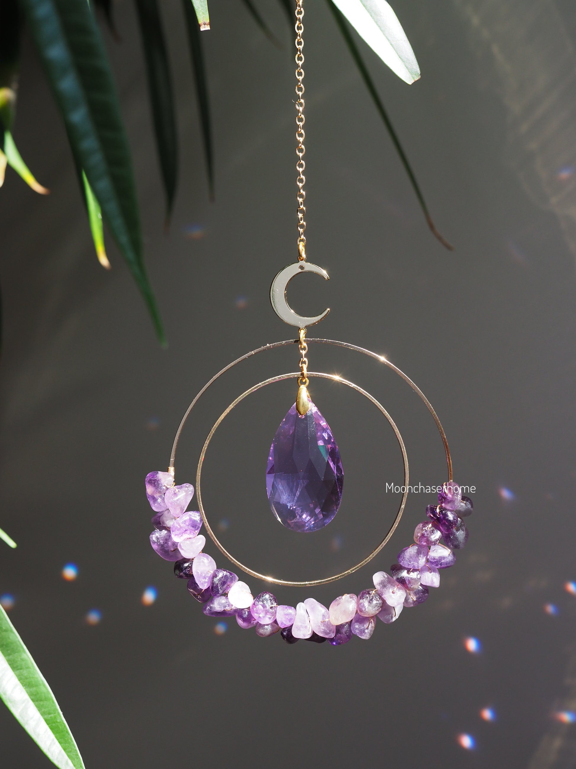 Handmade suncatcher with 18K real GOLD PLATED Moon+ circles + natural crystals: amethyst/ rose quartz / clear quartz/ fluorite/ jade/blue sandstone/green aventurine/tiger eye/ citrine/indian agate/smoky quartz/onix/ labradorite/amazonite/milky quartz/strawberry quartz ect. crystals.